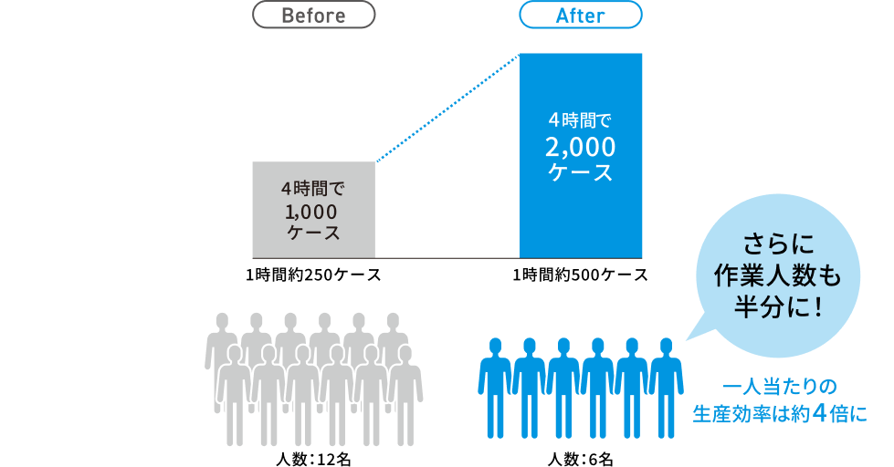 出荷量の増加でシーズン内に手作業では発送できない、という課題があり、販売数量を拡大する為、機械化を検討し、H20の導入に至った。